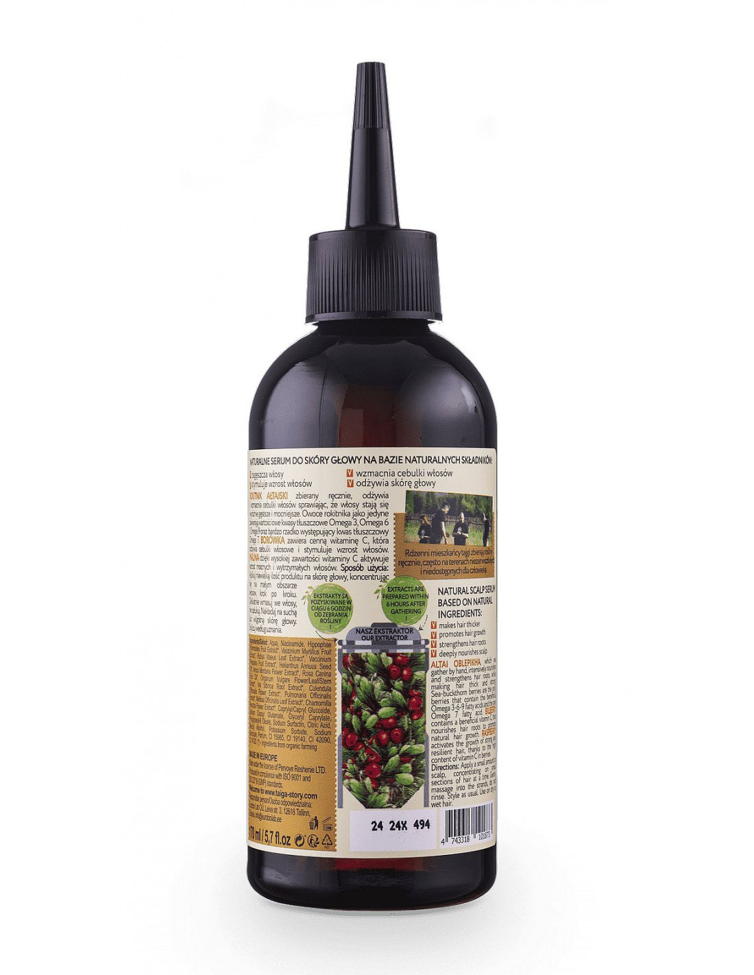 Naturalne serum do skóry głowy pobudzające wzrost włosów z rokitnikiem ałtajskim, maliną i borówką.