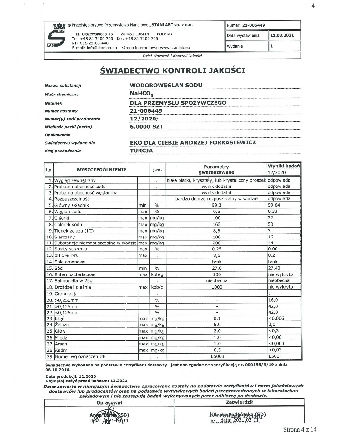 wodorowęglan sodu NaHCO3– bez dodatku antyzbrylaczy