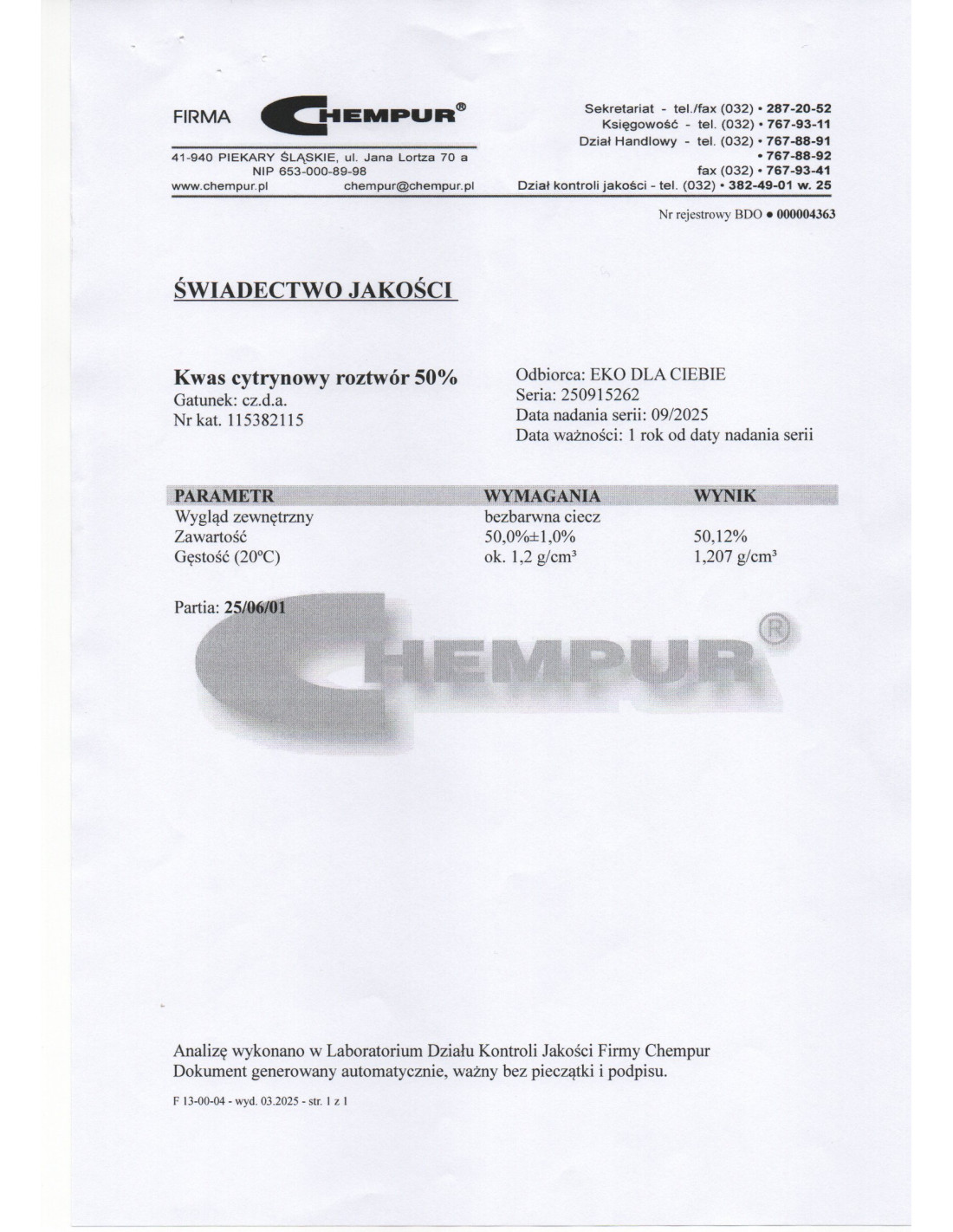 Producent: Firma :CHEMPUR” ul. Jana Lortza 70a, 41-940 Piekary Ślaskie