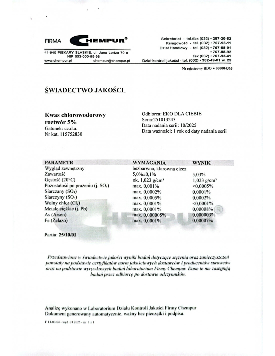 Producent: Firma Chempur, 41-940 Piekary Śląskie, ul. Jana Lortza 70A