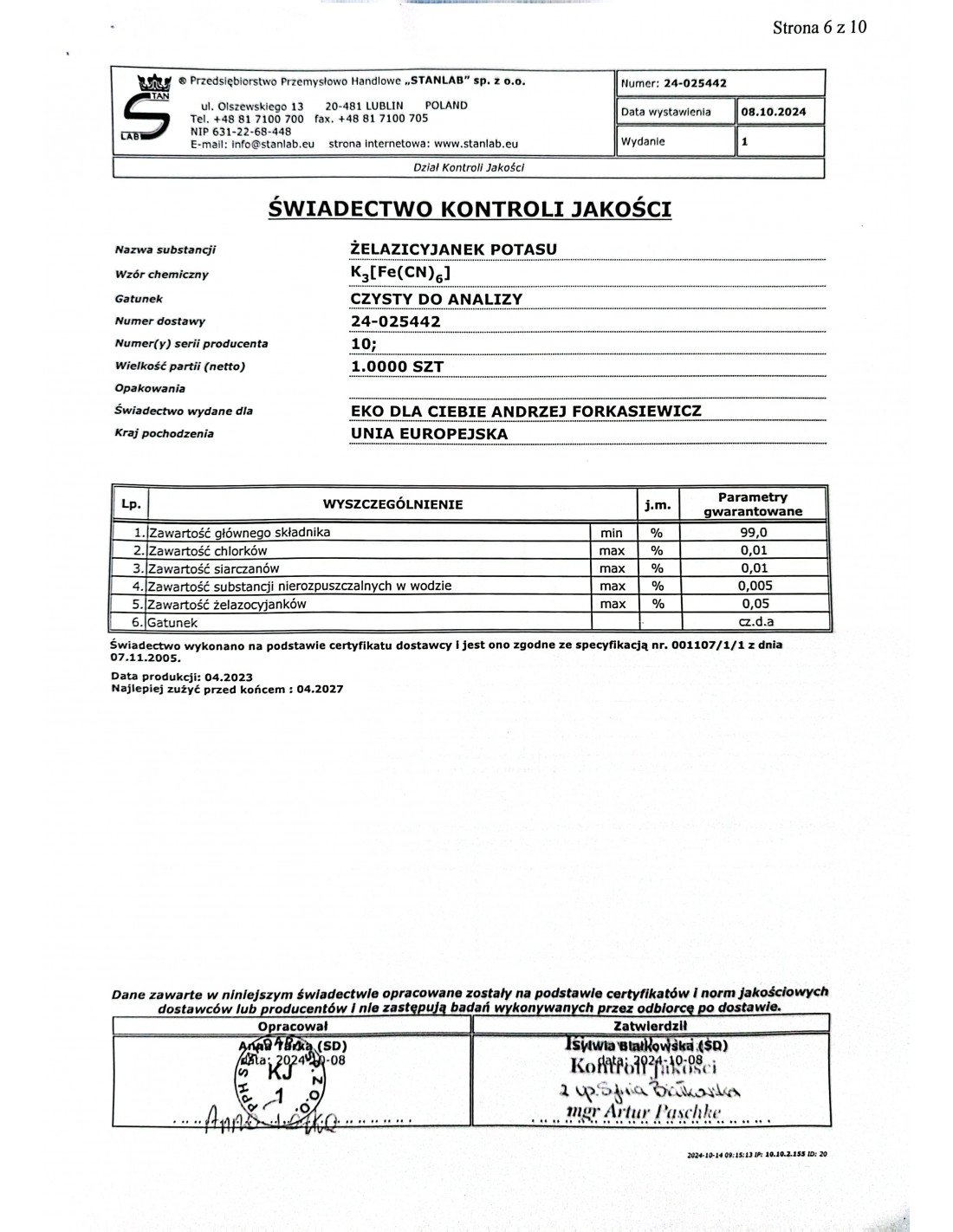 Przed użyciem żelazicyjanku potasu zapoznaj się z kartą charakterystyki - w załaczniki