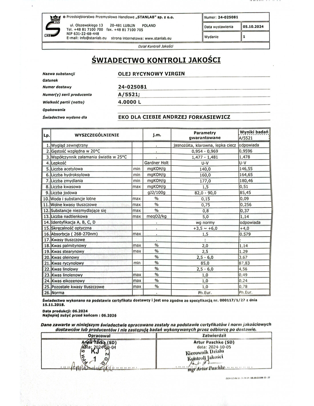 Synonimy : Trójgliceryd kwasów tłuszczowych pochodzenia roślinnego, głównie rycynolowego.