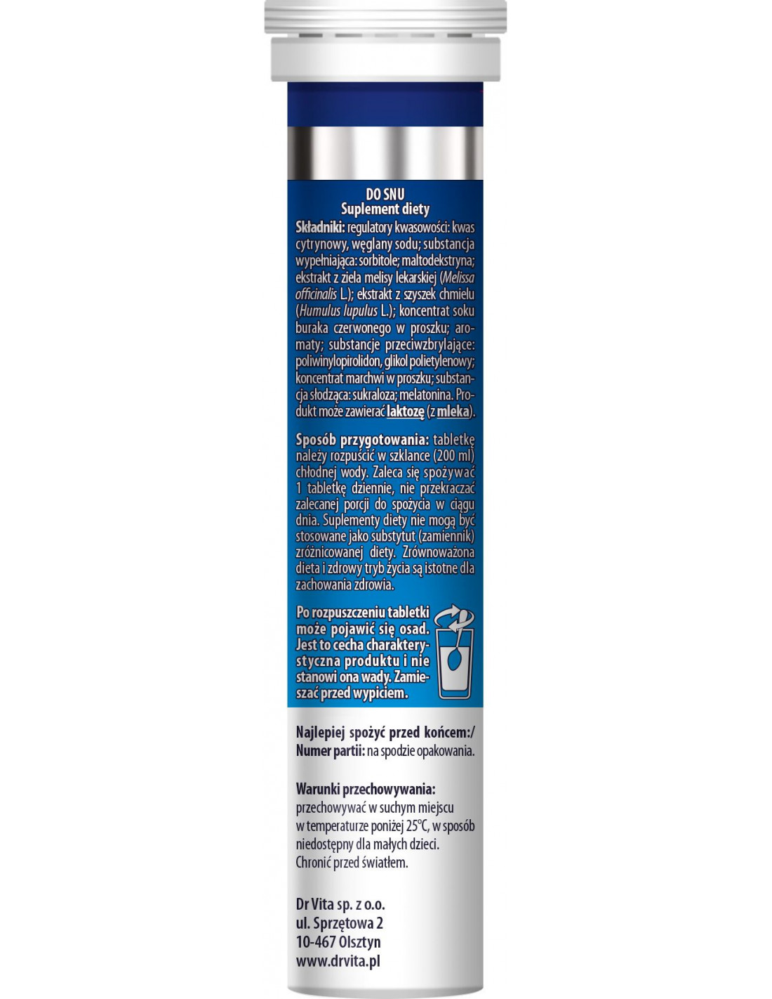 Składniki: regulatory kwasowości: kwas cytrynowy; diwęglan sodu; substas: wypełniająca: sorbitole; maltodekstryna; ekstrakt z melisy lekarskiej (Melisa officinalis L.), ekstrakt z szyszek chmielu (humulus Lupulus L.), koncentrat soku buraka czerwonego w proszku, aromaty, substancje przeciwzbrylające: poliwinylopirolidon, glikol polietylenowy,koncentrat marchwi w proszku, substancja słodzaca sukraloza, melatonina. Proszek może zawierać laktozę z mleka.