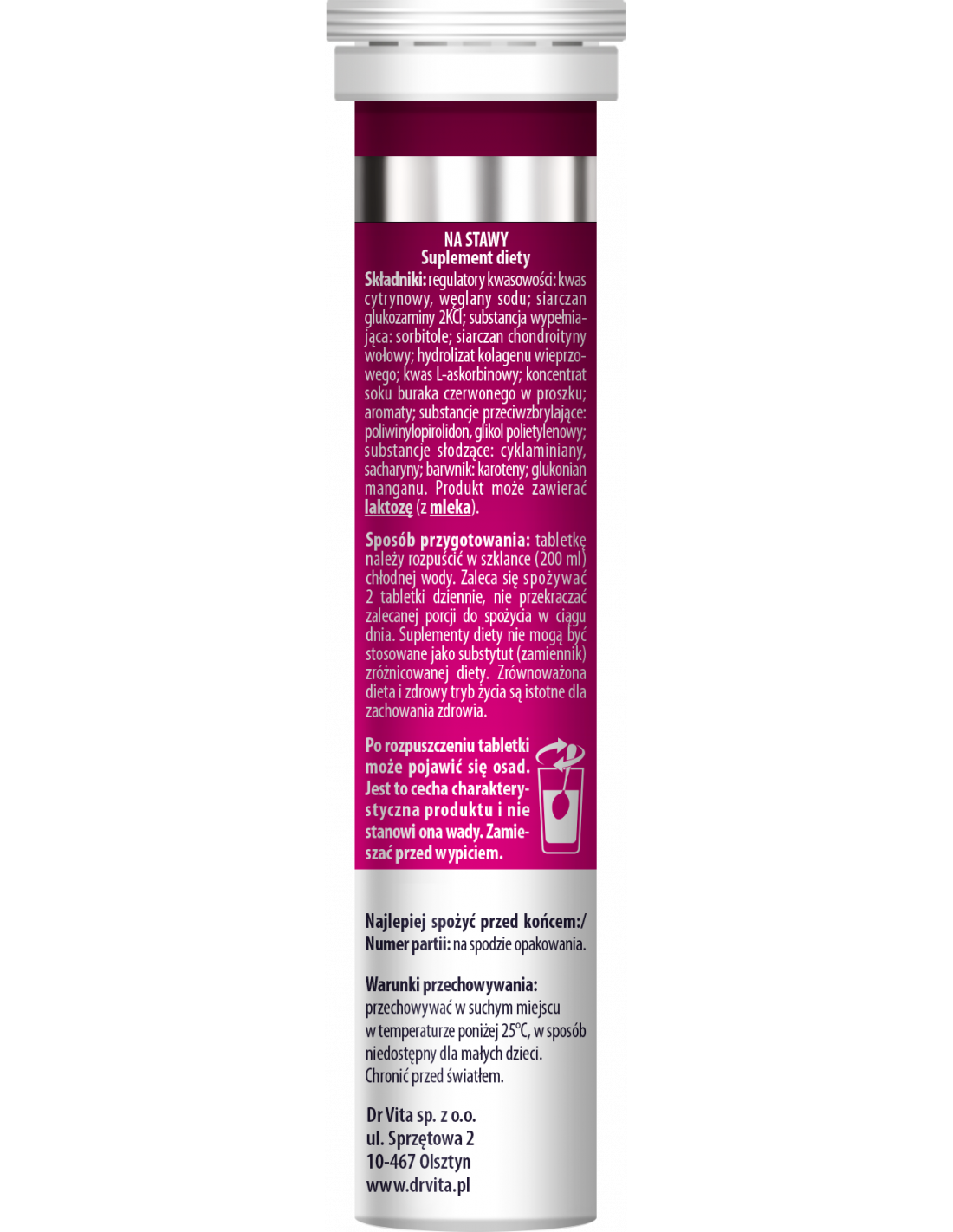Składniki: regulatory kwasowości: kwas cytrynowy; węglan sodu; siarczan chondroityny wołowy; hydrolizat kolagenu wieprzowego; kwas l-askorbinowy, koncentrat soku buraka czerwonego w proszku; aromaty; substancje przeciwzbrylające poliwinylopirolidon, glikol
