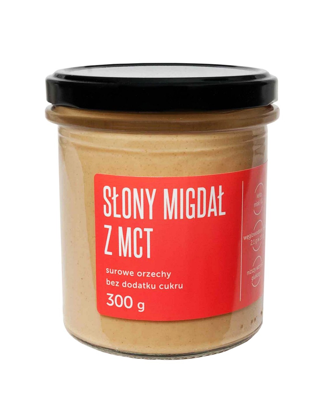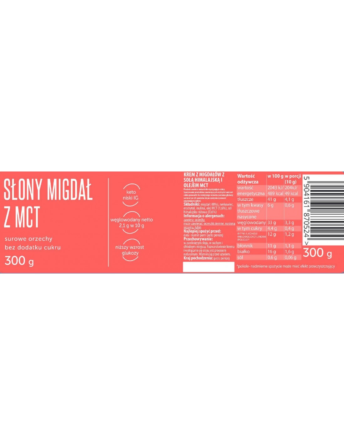 Migdał (48%) , nerkowiec, erytrytol, inulina, olej MCT (1,6%), sól himalajska różowa (0,6%)